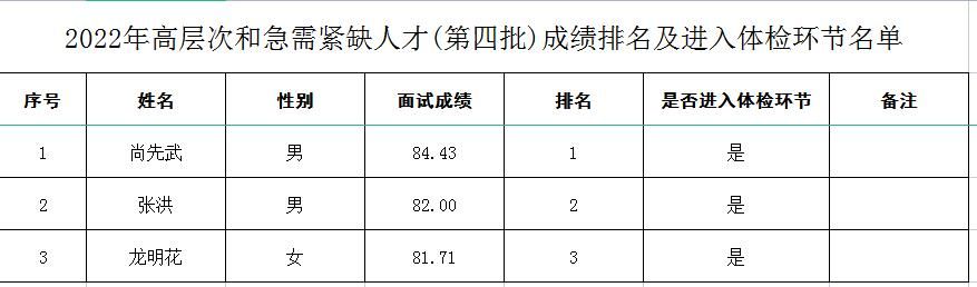 附件:2022年高層次和急需緊缺人才(第四批)面試成績排名及進(jìn)入體檢環(huán)節(jié)名單