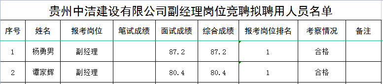 根據(jù)《貴州中潔建設有限公司副經(jīng)理崗位競聘實施方案》規(guī)定,經(jīng)報名、資格審查、面試、考察等程序,現(xiàn)將擬聘用人員名單予以公示。